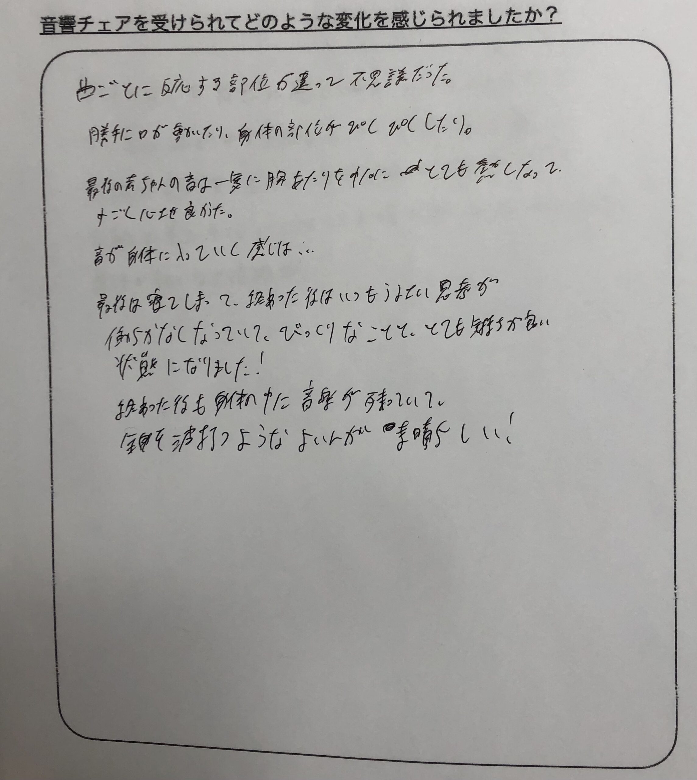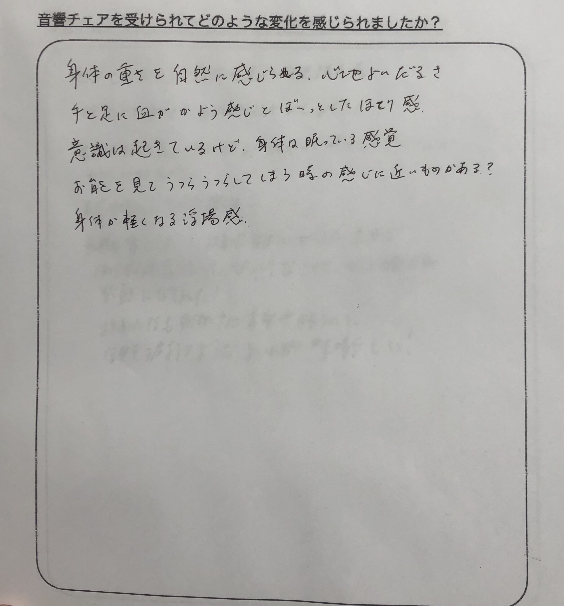 背骨からの振動が全身に響き渡り音に包まれる感じでした。終わった後は全身がスッキリ。今まで味わったことのない体験でした。身体がポカポカ温かくなり、緩んでいる感じです。