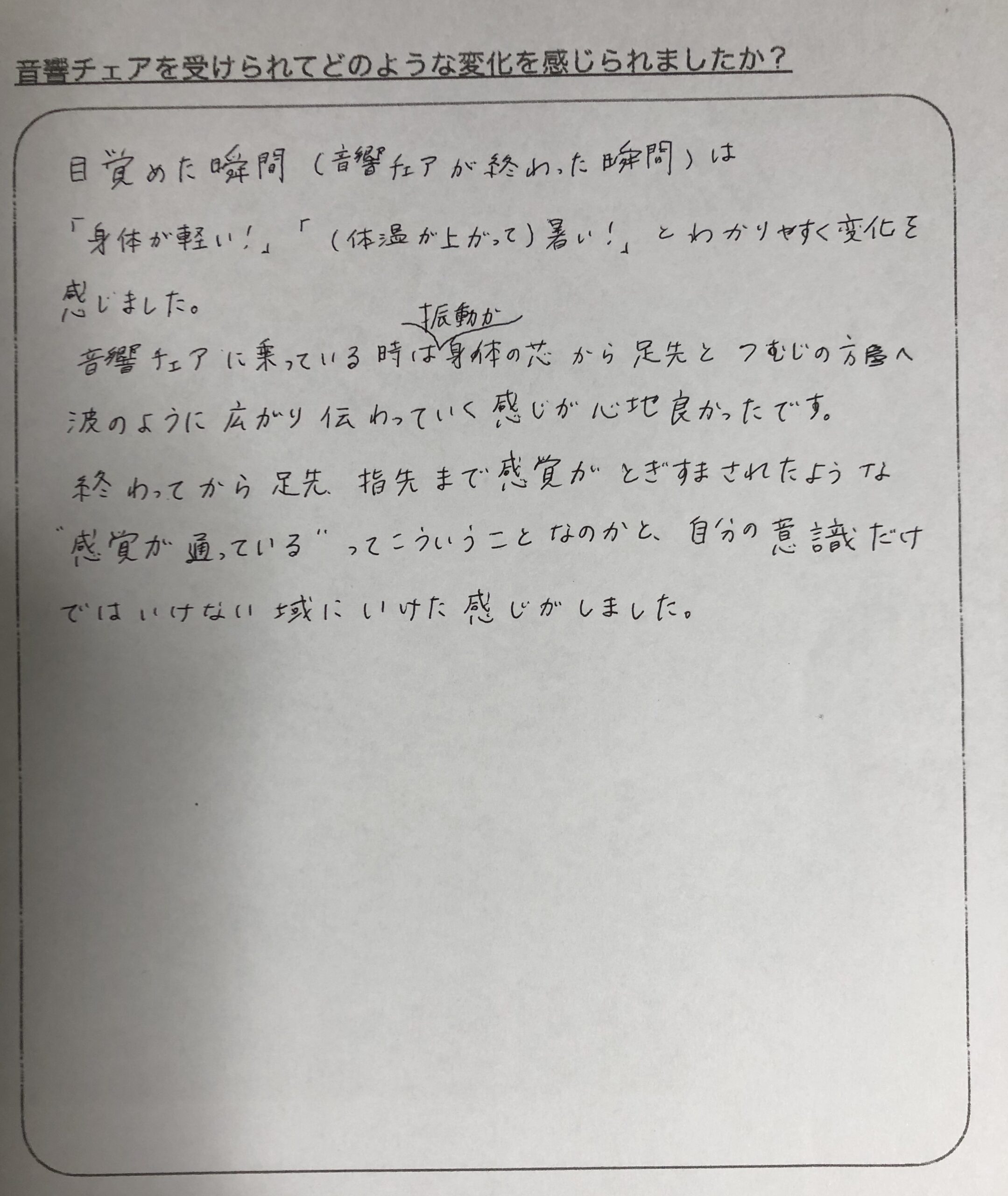 座っている間は、身体の左側ばかりに振動を感じ、座り方がおかしいのかな、と思って右側もひびく箇所を探しにいったりしていましたが、かたくなっている不自然な箇所の方がひびくと伺い納得しました。終了後は寝起きのように頭が働かない感じでしたが心地いいものでした。体温も上がった実感がありました。