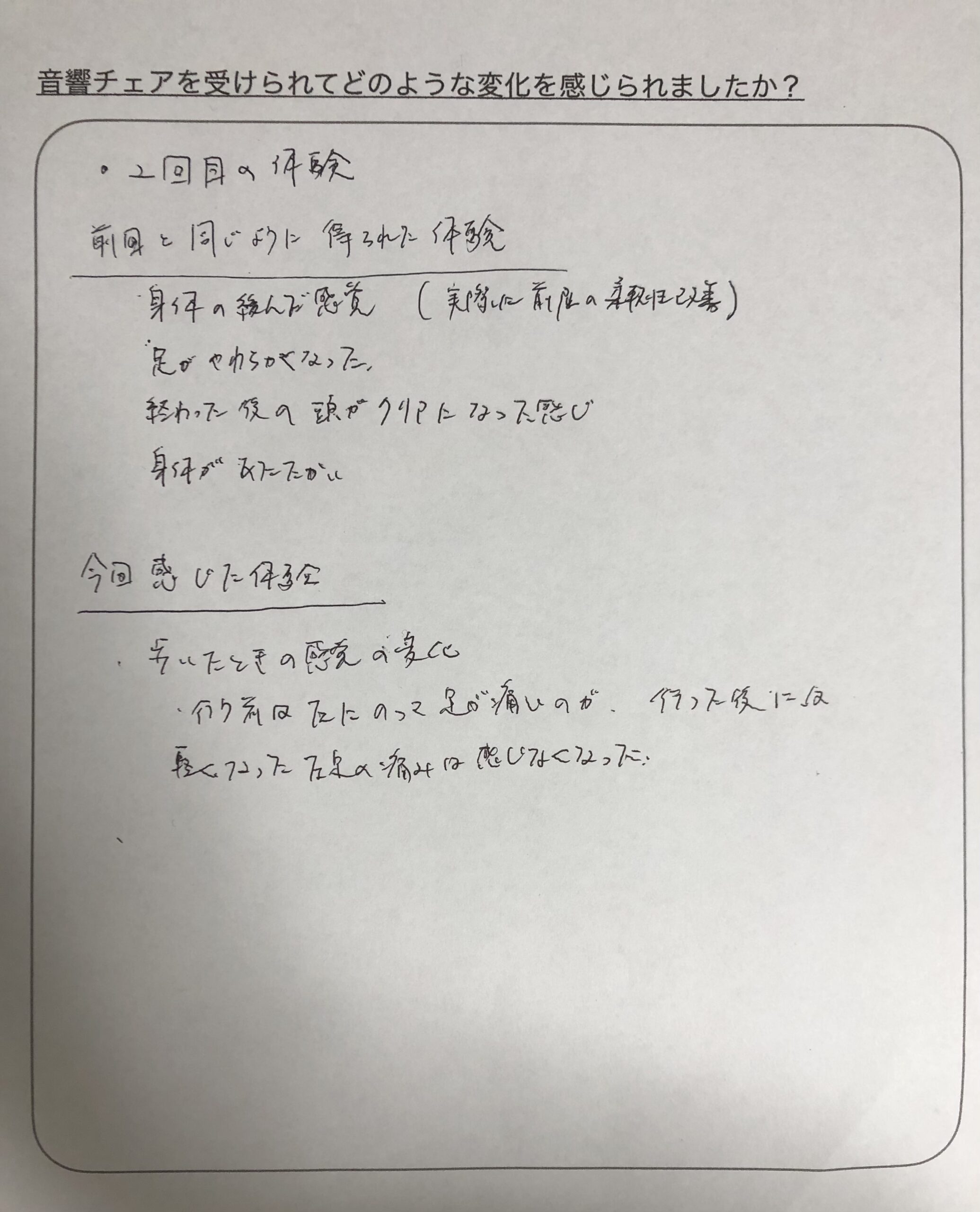 (2回目体験)身体の緩んが感覚、足が柔らかくなった、頭がクリアになった感じ、身体が温かいのは前回と同じ感覚です。新たに、歩いたときの感覚の変化があり、体験前は左足に体重が乗っていて痛かったのが、体験後に左足が軽くなり、痛みは感じなくなっていました。